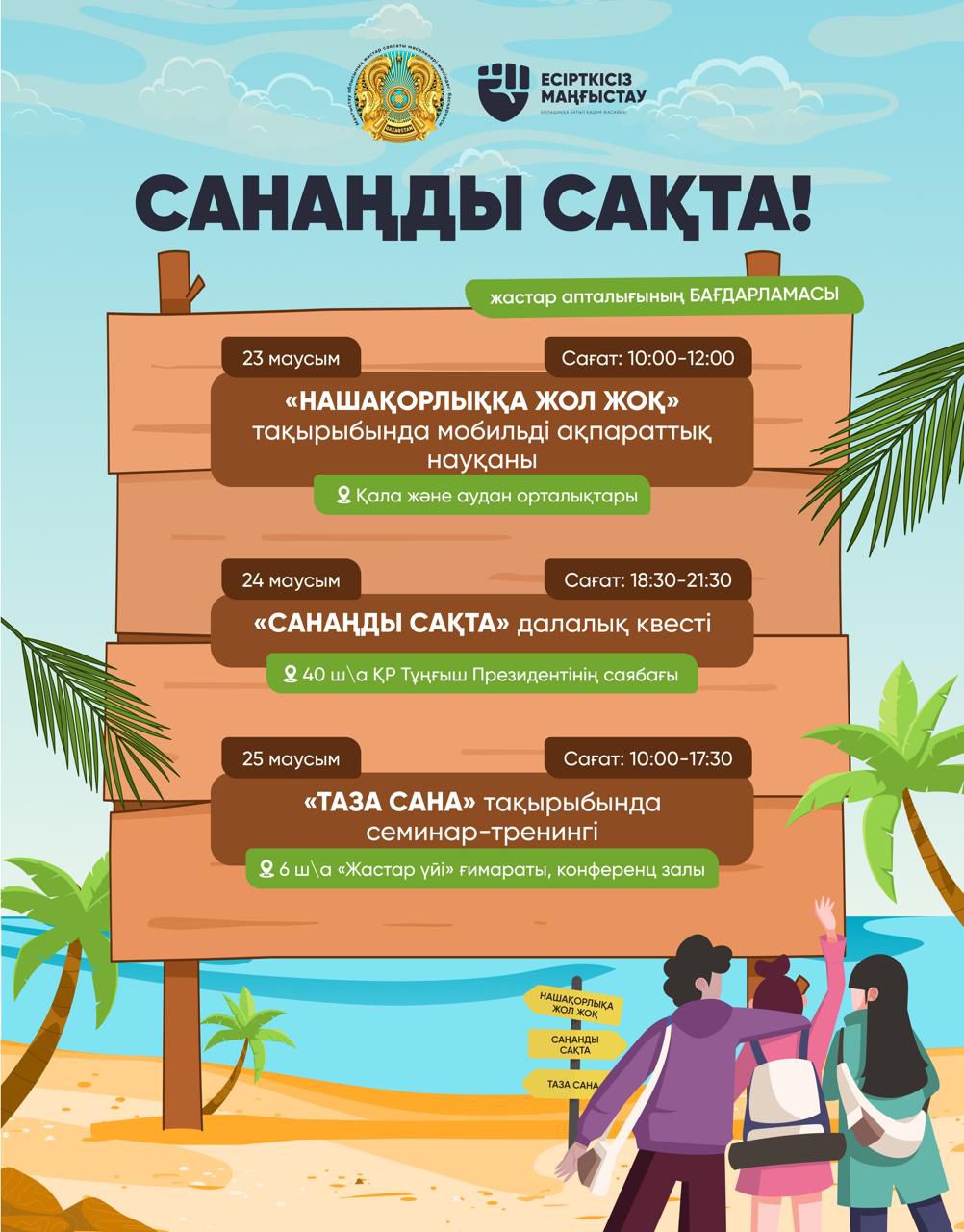 Атап айтқанда, 26 маусым – Халықаралық нашақорлықпен күрес күніне орай «Санаңды сақта» атты жастар апталығы өтеді. Апталық 23–27 маусым аралығында болады.