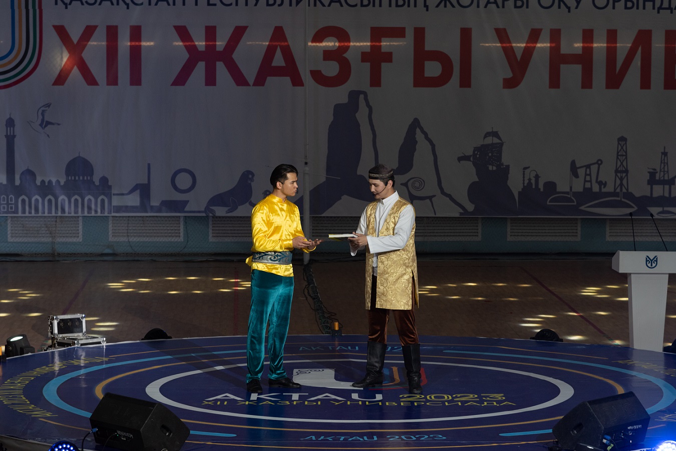 Салтанатты жиын «Маңғыстау-Арена» спорт кешенінде ұйымдастырылды. Оған мыңдаған адам жиналып, шоу бағдарламаны тамашалады. Ал универсиадаға қатысушы спортшылардың салтанатты шеруі сахнаның сәнін арттырды. Соныиен қатар кеш қонақтарына «Кемелдікке жеткізер күш – білім мен ғылым!» атты театрландырылған қойылым ұсынылды.
